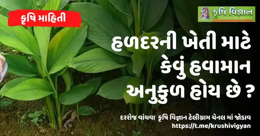 હળદરની ખેતી માટે અનુકુળ હવામાન હળદરના કંદની વૃદ્ધિ માટે ગરમ હવામાન જરૂરી છે. વૃધ્ધિકાળ દરમિયાન સરાસરી ૩૨ થી ૩૬ સે.ગ્રે. ઉષ્ણતામાન જોઈએ. ઓછા ઉષ્ણતાપમાને તેની