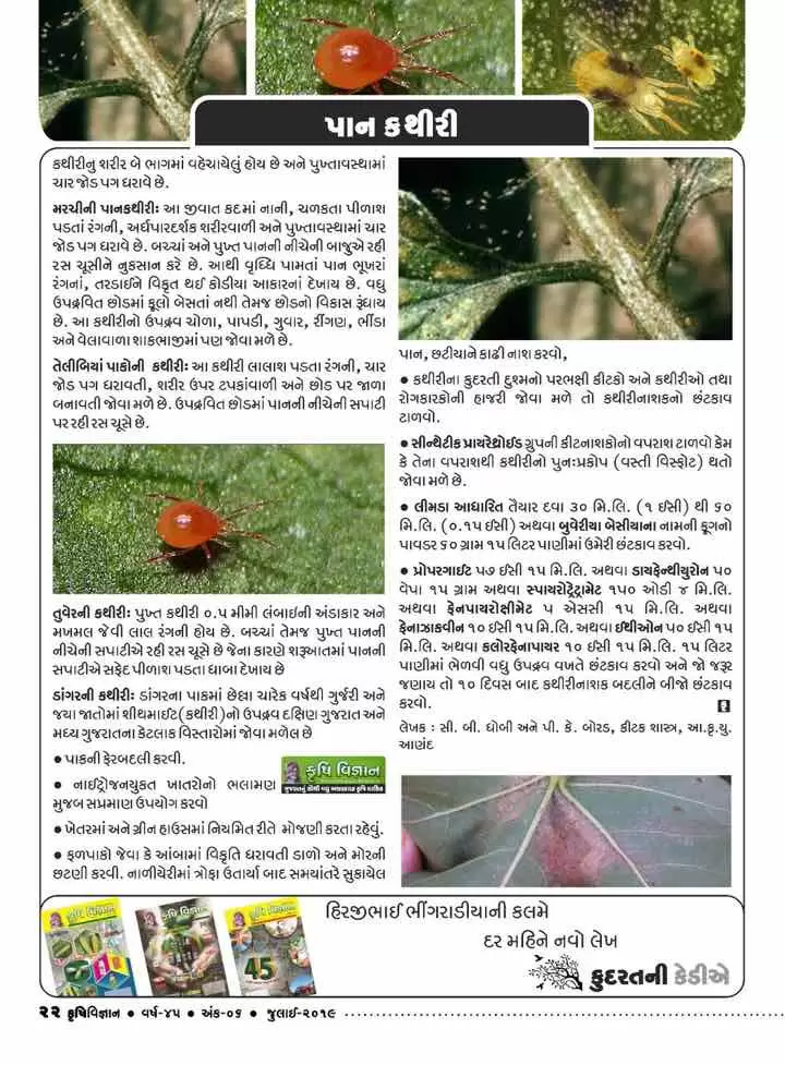 ભીંડા અને વેલાવાળા શાકભાજી પાનકથીરી ફેનાઝાક્વિન ૧૦ ઇસી ૧૫ મિ.લી. અથવા ફેનપ્રોપેથ્રીન ૩૦ ઇસી ૩૦ મિ.લી. અથવા સ્પાયરોમેસીફેન ૨૨.૯ એસસી ૧૫ મિ.લી. અથવા પ્રોપરગાઇટ ૫૭