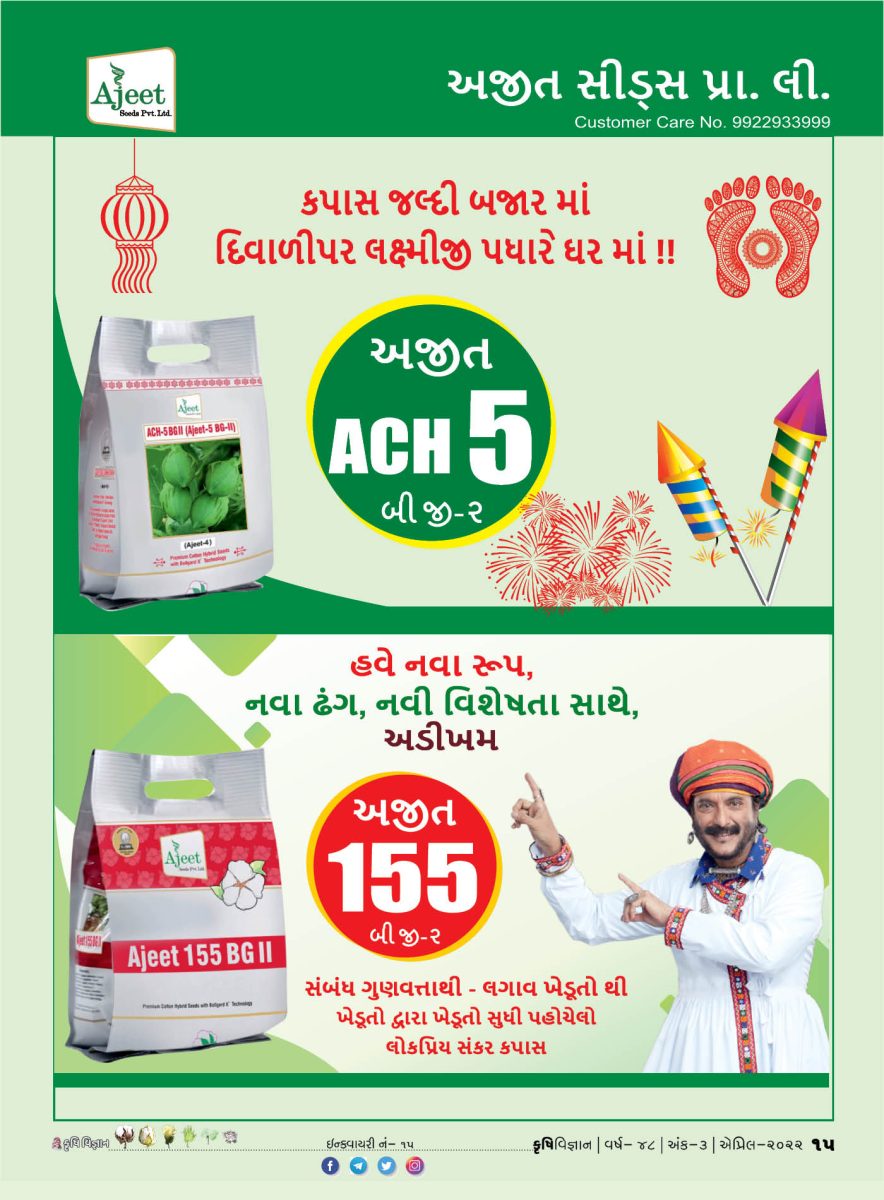 રમેશભાઈ વાલજીભાઈ ચારોલા મુ. બેડી. તા. જી. રાજકોટ મો. ૭૬૨૩૮ ૮૯૧૫૨ નમસ્કાર ખેડૂત મિત્રો મેં આ વર્ષે અજીત – ૯૦૦ બોલગાર્ડ- ૨ કપાસ મારી કાળી