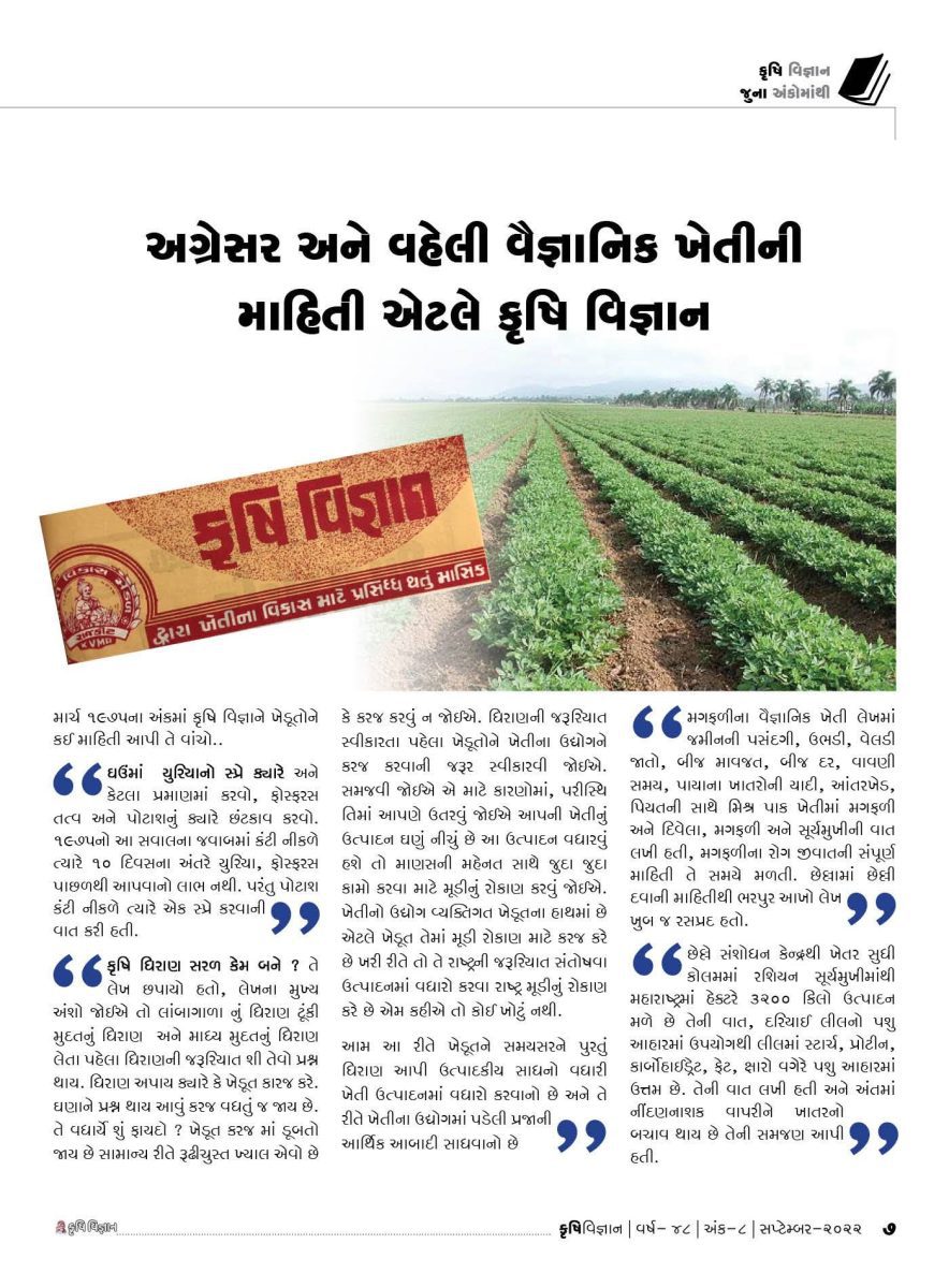 કૃષિ વિજ્ઞાનમાં શું વાંચવા મળે ? ફેબ્રુઆરી – વાર્ષિક અંકમાં ડ્રીપ ઈરીગેશન અને ફર્ટીગેશનના લાભની વાત. માર્ચ – મરચીની ખેતીની વિવિધ જાતોના ખેડૂતોના અનુભવો બીજ