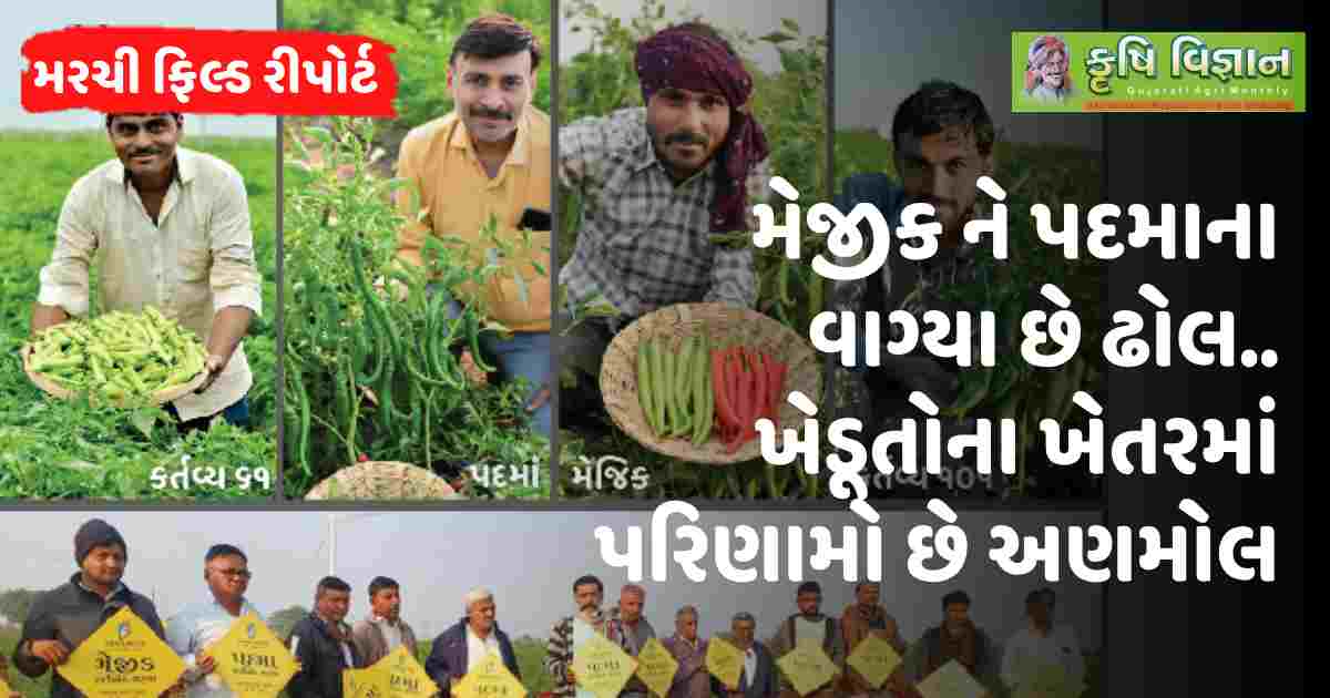 • 🌶 વાત જો પરીણામોની કરીએ તો સરેરાશ બે વીણીમાં ૩૦ થી ૩૫ મણ મરચુ ઉતરી ગયું છે ને ત્રીજી વીણીનો માલ છોડ પર તૈયાર થઈ રહ્યો છે. આ છે મેજીકના પરિણામો સાથે પદમા પણ ખુબ સુંદર છે કારણ કે બે વીણીમાં ૨૮ થી ૩૦ મણ ઉત્પાદન સાથે ત્રીજી વીણીના લાંબા મરચા જોઈ ખેડૂતો પણ આવતા વર્ષે વાવવા માટે ઉત્સુક છે તો તમે પણ શેની રાહ જુઓ છો? આ પાક નિદર્શનમાં ઘણા ખરા ખેડૂતોએ તો એડવાન્સ ટોકન આપી કંપની પાસે પોતાની જરૂરિયાત મુજબ પેકેટ બુક કરાવી દીધા છે સાથે સાથે કર્તવ્ય ૧૦૧ ને કર્તવ્ય ૬૧ પણ જબર પરીણામો સાથે એગ્રસર છે એવા સાકરોળાના ઉમેદભાઇ બસીયા હો કે ચરખડીના જયેશભાઇ લીલા કે ઉમરાળીના મેહુલભાઇ રાણપરીયા કે ઇશ્વરીયાના મયુરભાઇ વોરા એટલે તો કૃષિ વિજ્ઞાનના તંત્રીશ્રી એ પણ બોલ્યા મેજીક ને પદમાના વાગ્યા છે ઢોલ ખેડૂતોના ખેતરમાં પરિણામો છે અણમોલ..